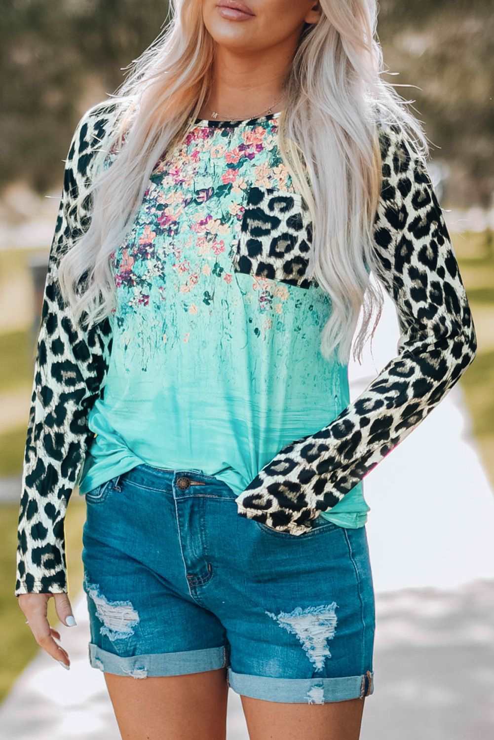 This patchwork top has a round neck, leopard raglan sleeve and tie-dye body with leopard chest pocket decor