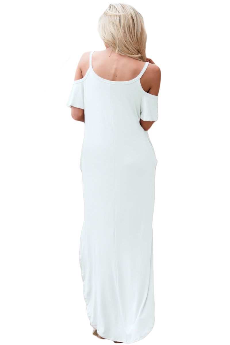 Be pretty and turn heads in this simple chic maxi dress. A real showstopper, this graceful floor-length dress is carefully crafted with signature jersey fabric which boasts an element of stretch, and is soft to the touch and light-weight against the skin. Low neckline, cold shoulder with ruffle sleeves, side pockets, double slit and a round hem finished for a figure-flattering silhouette. The perfect option for cool holiday and casual occasions! Features