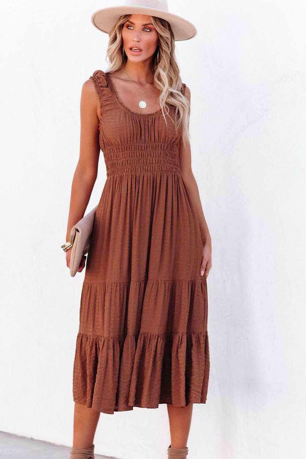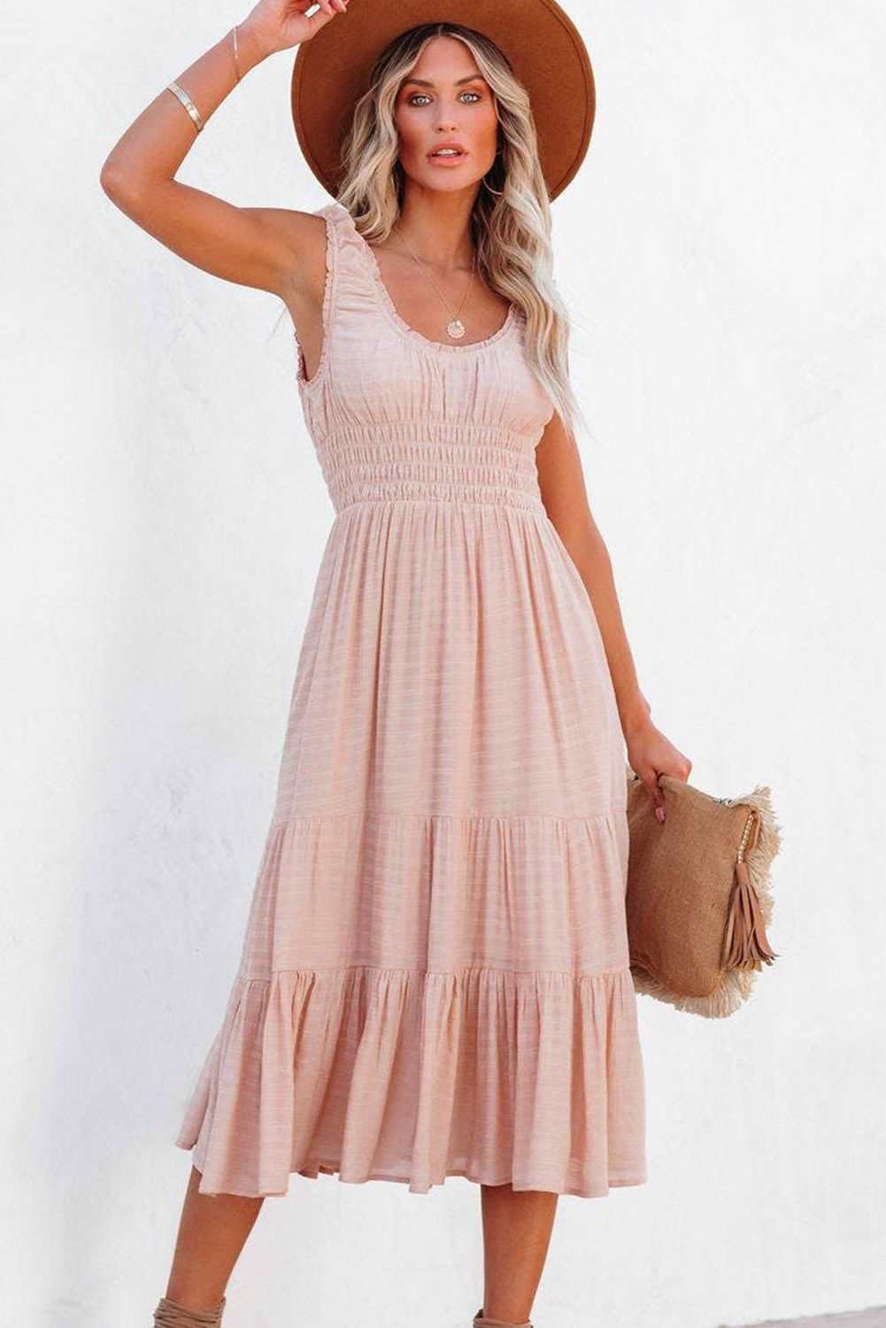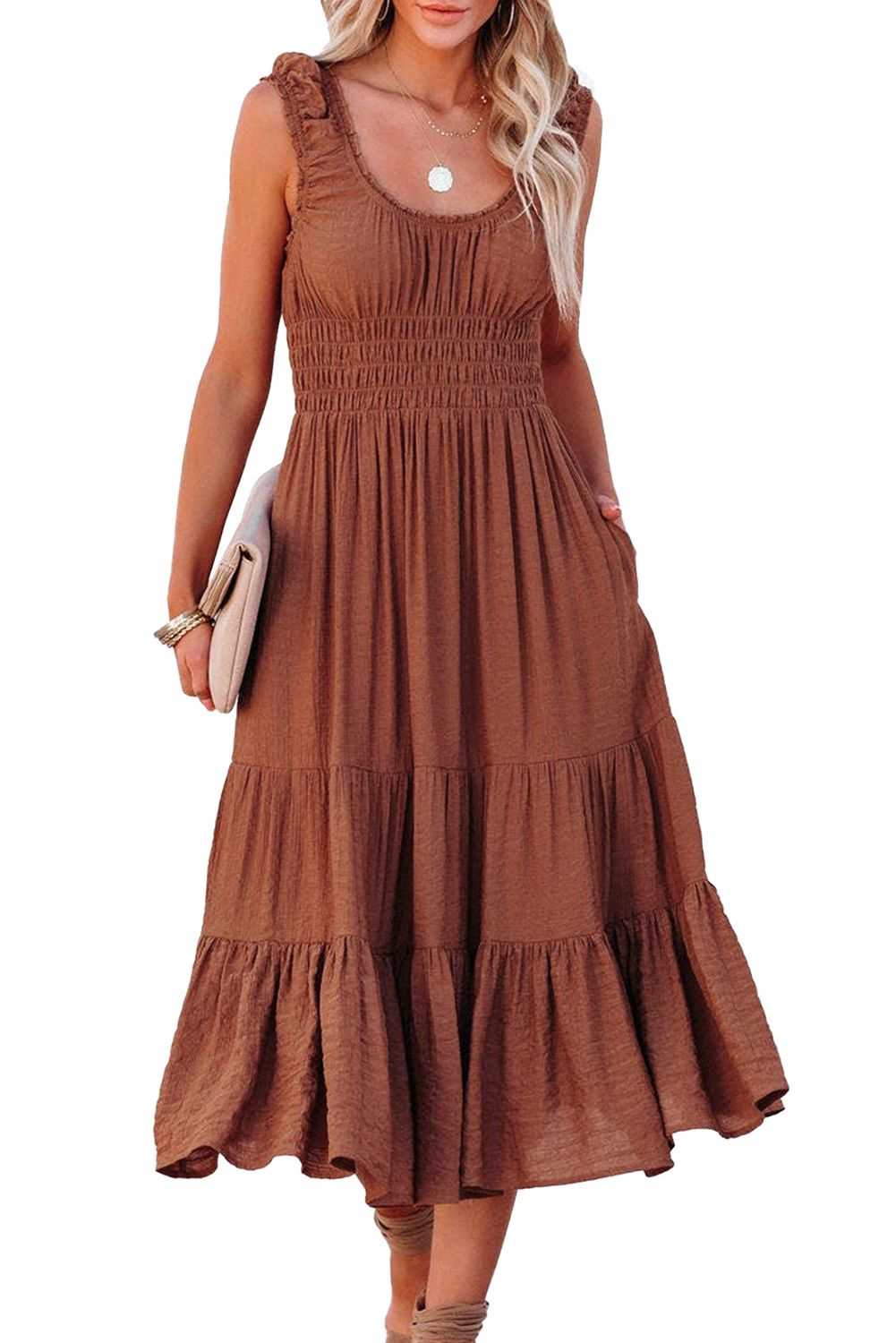 - Designed with a scooped neckline, a smocked waistband and a flowy skirt